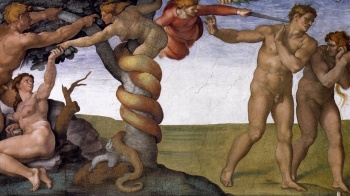 Convivieron allí muy felizmente Adán y Eva con los animales hasta que, un día, una serpiente -que no era sino una encarnación del demonio- les retó a comerse la manzana (aunque lo tenían prohibido por Dios). Eva comió primero e hizo comer a Adán. Y Dios se dio cuenta y los maldijo y expulsó del Paraíso, condenándolos a ser mortales, a parir con dolor los hijos y a tener que trabajar para vivir.