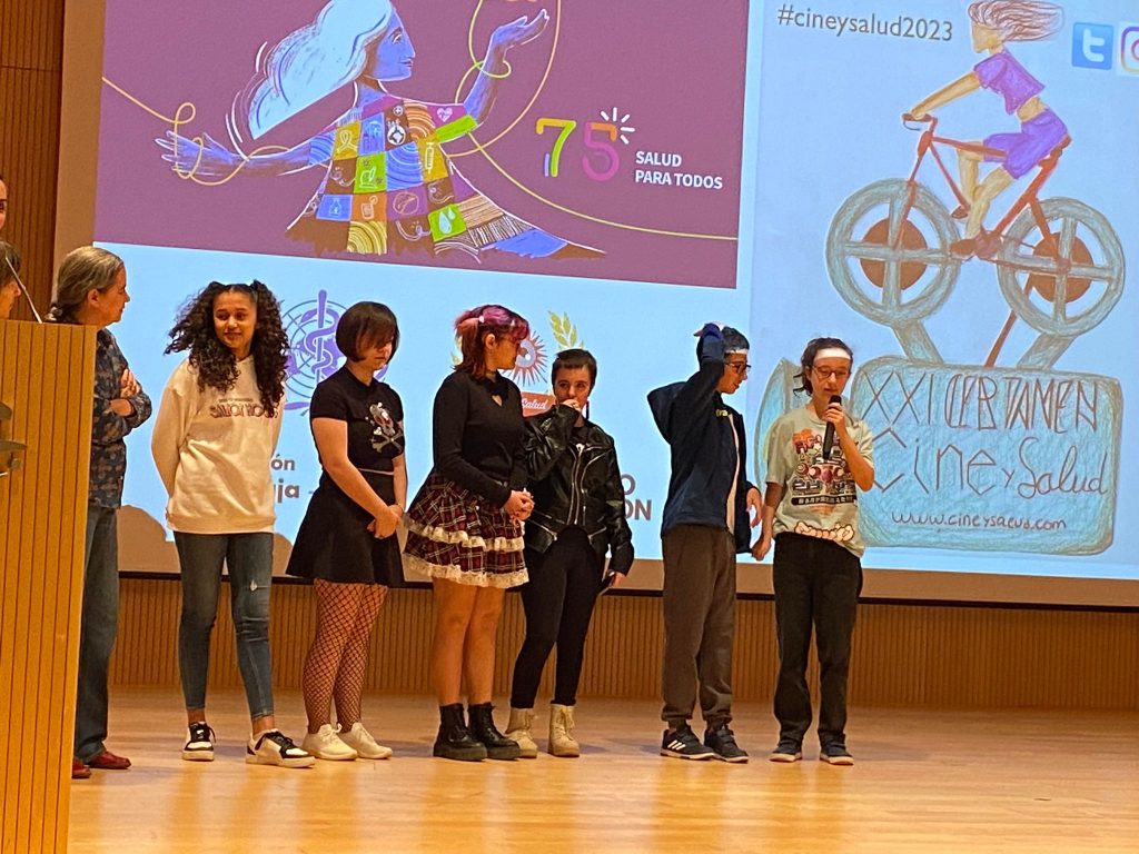Nuestro corto fue seleccionado, con otros 22 realizados en centros educativos y sanitarios de todo el país para su visionado en la gala final del Certamen. Y el día 15 de abril llegó la hora de presentarlo al público, después del estreno en nuestro IES, y de los nervios de hablar en público y de la emoción del premio por un trabajo de equipo que ha traído una buena cantidad de aprendizajes.