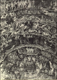 - Infierno (1304-1308): En este canto, Dante baja al infierno en busca de Beatriz y, a su vez, para redimir su alma, con la compañia de Virgilio, al cual admiraba mucho. En su recorrido por los nueve círculos del infierno, Dante ve a muchos personajes históricos importantes; uno de ellos, Judas Iscariote, que es constantemente torturado por Lucifer.
