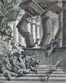 Cuando los príncipes filisteos se reunieron con el propósito de ofrecer sacrificios a Dagón, su dios, llevaron a Sansón al templo para burlarse de él. Encadenado entre dos gruesas columnas, Sansón soportó las risas y burlas de los más de tres mil filisteos que allí había. Humillado por sus enemigos, el héroe tanteó las columnas que lo flanqueaban y pidió a Yahveh que le diera fuerzas tan sólo una vez más. Yahveh escuchó su petición, entonces Sansón exclamó: "¡Muera yo con los filisteos!"